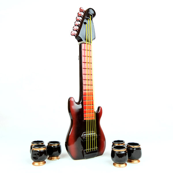 Подарунковий набір для спиртного «Електрогітара» — це пляшка для спиртного у формі електричної гітари зі струнами в комплекті із шістьма рюмками. Гітара та чарки виготовлені з кераміки.